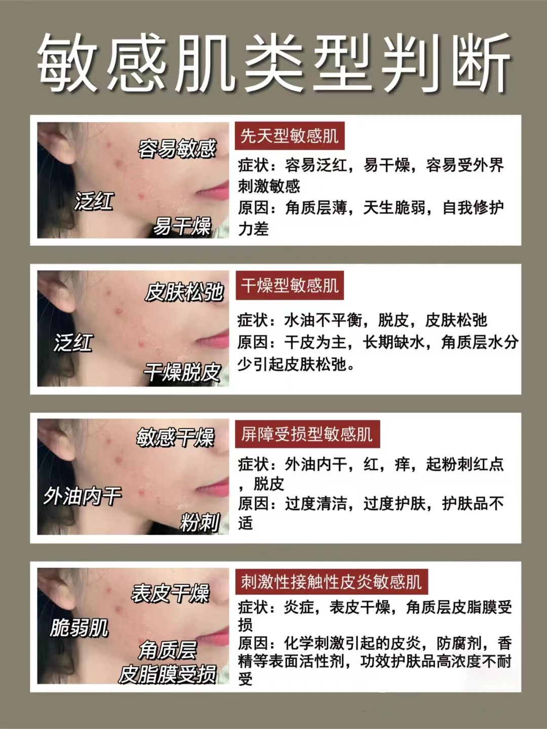 主观症状明显,客观症状轻微。受到物理、化学、精神等轻微刺激就产生强烈反应,常常不能耐受普通护肤品。疗原则是以提高皮肤的耐受性为目的进行治疗。