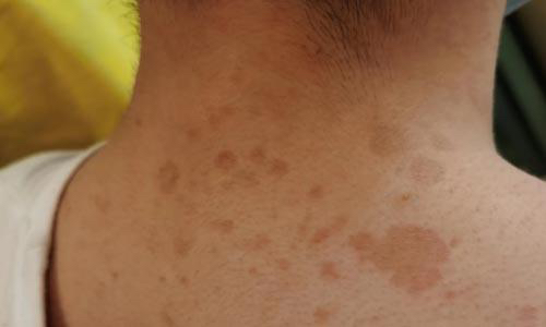 汗斑的皮损多表现为圆形或不规则的斑疹,颜色可呈褐色、淡褐色、淡红色、淡黄色或白色等,表面可覆糠秕状鳞屑。大部分人没有痛痒的感受,容易在夏季发病,如果不治疗可持续多年。