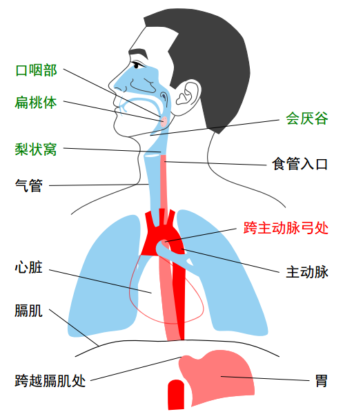 图1 口咽、喉咽、食管及临近重要结构的示意图。从图中可以看出食管在行进至胃的过程中会在很长一段与气管及主动脉伴行,并于心脏临近。图中绿色字体标注的部位的异物可以在耳鼻喉科以较小的代价予以取出,而在这之下的部位则取出较为困难,代价也将极大的增加。
