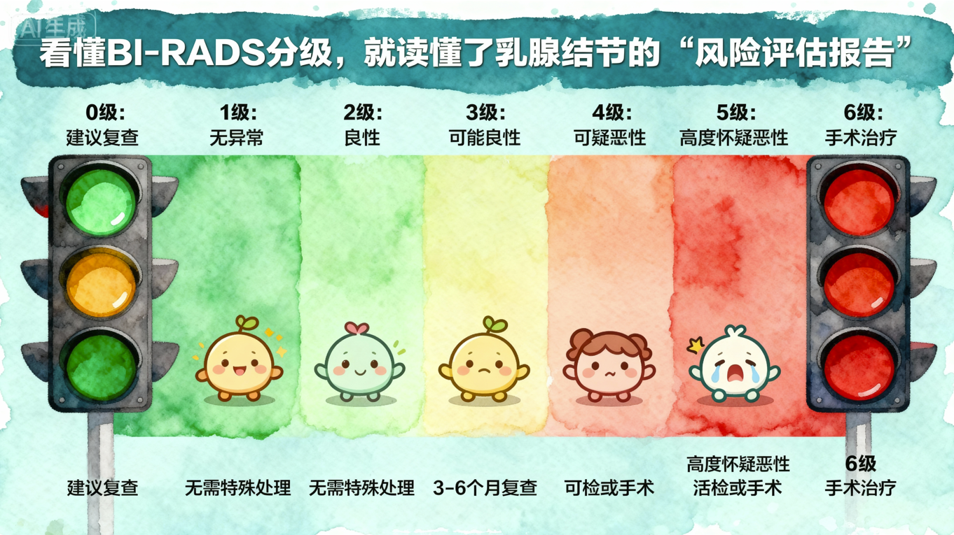 BI-RADS 1-2级: 优质业主/明确访客。正常或明确良性(如水球和典型软糖),无需担心,常规年检。