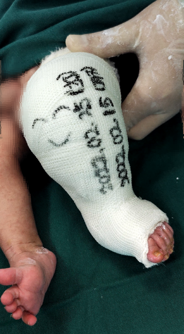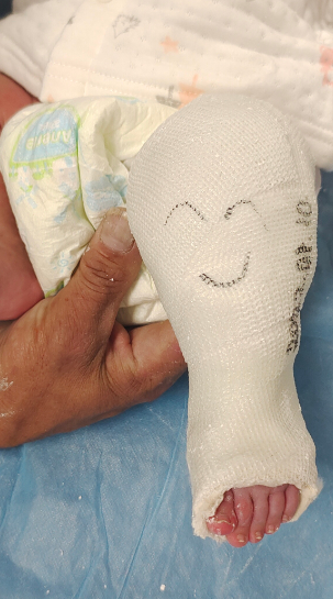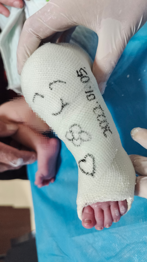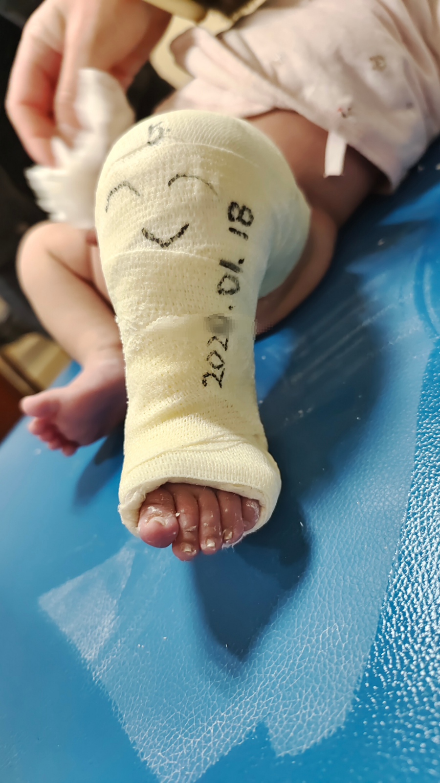 经过足踝外科王雁智和董仕超医生一个月的精心治疗,小益西的左脚畸形得到有效矫正。看着孩子一点点康复,从他出生就笼罩在这个小家庭的阴云逐渐散去,小益西的父母脸上又重新展开笑颜,生活又重新充满了希望!为照顾孩子的医护们点一个大大的“赞”,拍一张合影,是一家人最开心的瞬间!