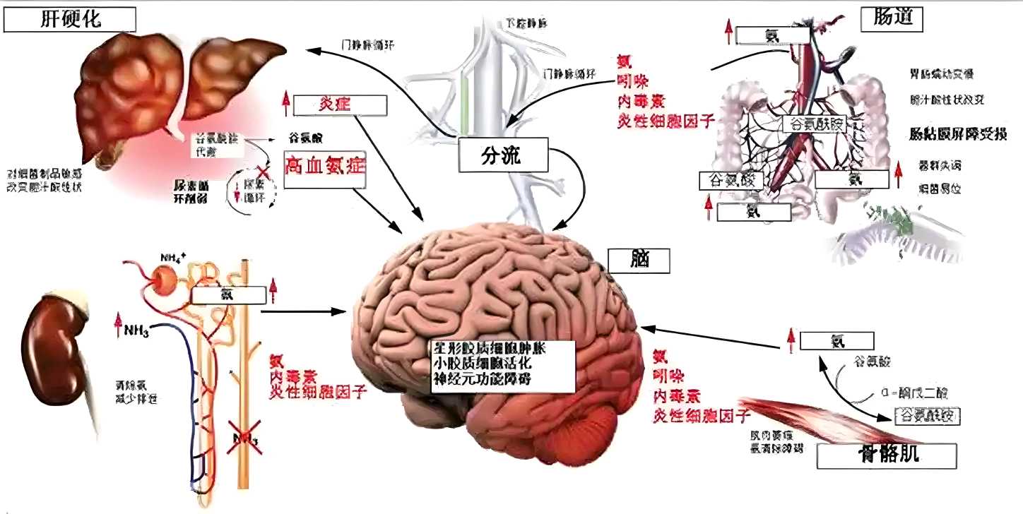- 氨代谢失衡:门体分流导致血氨无法被肝脏代谢,直接进入脑组织,干扰神经传导。
