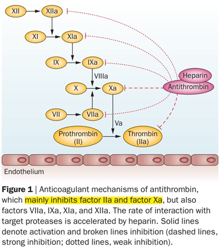 抗凝血酶(AT),也被称为抗凝血酶III(AT-III),主要由肝脏合成,是一种丝氨酸蛋白酶抑制剂,能通过抑制凝血途径中的丝氨酸蛋白酶的活性而发挥抗凝作用,是人体最重要的生理性抗凝因子。如果这位“消防员”偷懒(活性降低),可能引发致命的血栓危机!凝血过程中活化的凝血因子,除了Va和VⅢa(Va和VⅢa不属于丝氨酸蛋白酶),其余因子(包括IIa、VIIa、Ⅸa、Ⅹa、Ⅺa、Ⅻa因子)均能不同程度的被AT抑制,尤其是凝血瀑布的核心——活化的X因子(Xa)和凝血酶(IIa)。AT的抗凝作用占到了抗凝系统的70%左右,是当之无愧的“灭火队队长”。