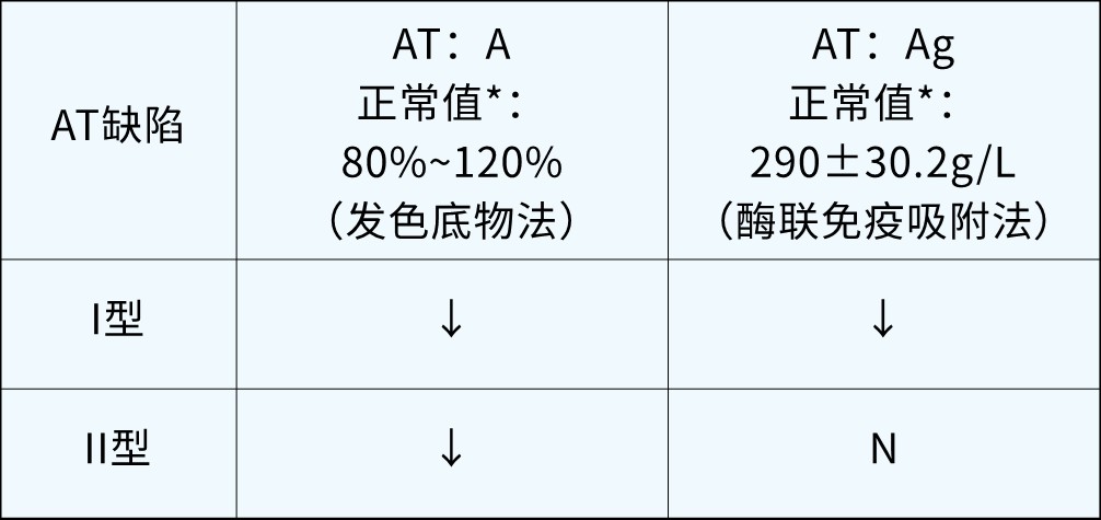 AT检测包括AT活性(antithrombin activity,AT∶A)检测和AT抗原(antithrombin antigen,AT:Ag)检测,抗原检测即含量检测。根据AT活性和抗原的检测结果,可将AT缺陷症分为I型和II型,其中I型缺陷指“量”的变化,体现在检测结果上为活性和抗原水平同时下降;II型缺陷仅指“质”的变化,体现在检测结果上为活性下降,抗原水平正常(见下表)。AT活性检测常用发色底物法,抗原检测常用酶联免疫吸附法。