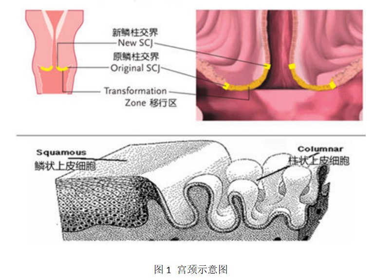 在宫颈上,有两种不同类型的细胞,靠近阴道内的是鳞状上皮细胞(Squamous cell),而靠近子宫方向的是柱状上皮细胞(columnar cell),如图1。两种上皮在外观上表现是不同的,正如文章开头的图片,是在妇科检查下所见到的宫颈外观。在中央的鲜红色部分,有点看起来象是“糜烂”的宫颈的部分,就是柱状上皮覆盖了以后的外观,而外侧相对比较光滑的淡红色宫颈,则是鳞状上皮细胞覆盖的宫颈的部位。柱状上皮细胞和鳞状上皮细胞是处在一个动态的平衡,有点类似打仗起来的僵持区,这个区域在医学上被命名为“鳞柱交界区”,原鳞柱交界和新鳞状交界之间的转化区,因细胞状态不稳定,是宫颈癌的好发区域。鳞柱交界区的细胞容易受雌激素的影响,来月经以后,青春期或育龄期女性的柱状上皮受雌激素的影响下,更多地朝外侧发展,因此妇科检查的时候就可以看到类似“糜烂”一样的柱状上皮。所以,所谓的宫颈糜烂,实际上是柱状上皮外翻或柱状上皮异位,是生理现象,而不是病。