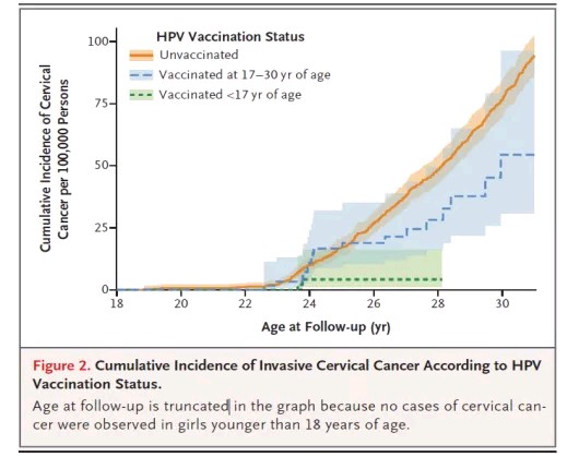 2020年,新英格兰医学杂志发表一篇文献证明HPV疫苗能有效预防侵袭性宫颈癌:瑞典167万女性2007年陆续实施HPV疫苗接种,与未接种疫苗相比,17岁前接种HPV疫苗可减少88%的侵袭性宫颈癌;18-30岁接种可减少53%。