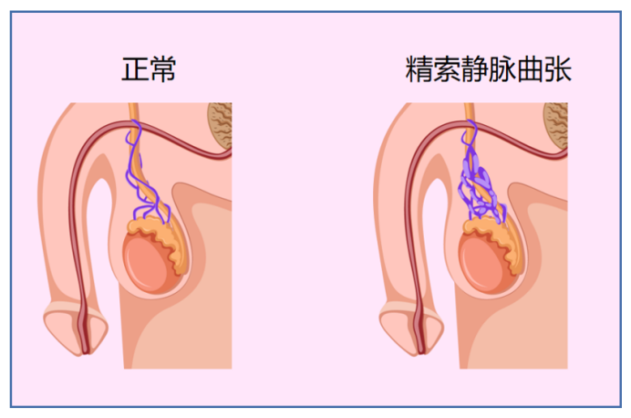 2、病因是什么?精索静脉曲张发生与下列因素有关:①静脉瓣有防止静脉血返流的作用,当精索静脉瓣缺如或功能不良时可导致血液返流。②精索静脉壁及其周围结缔组织薄弱或提睾肌发育不全。③人的直立姿势影响精索静脉回流。左侧精索静脉曲张较右侧常见,可能原因为:①左侧精索内静脉行程长,呈直角汇入左肾静脉,静脉压力较大;②左肾静脉在肠系膜上动脉与腹主动脉之间受压,影响左侧精索内静脉回流甚至导致返流(称为“胡桃夹”现象);③精索内静脉瓣缺如更常见于左侧