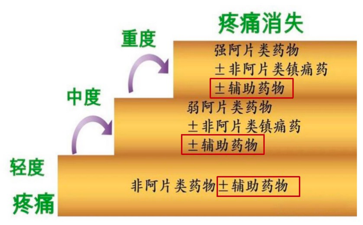 个阶梯的止痛药物均可根据患者的不同疼痛性质而联合使用辅助药物,从而达到更好的止痛