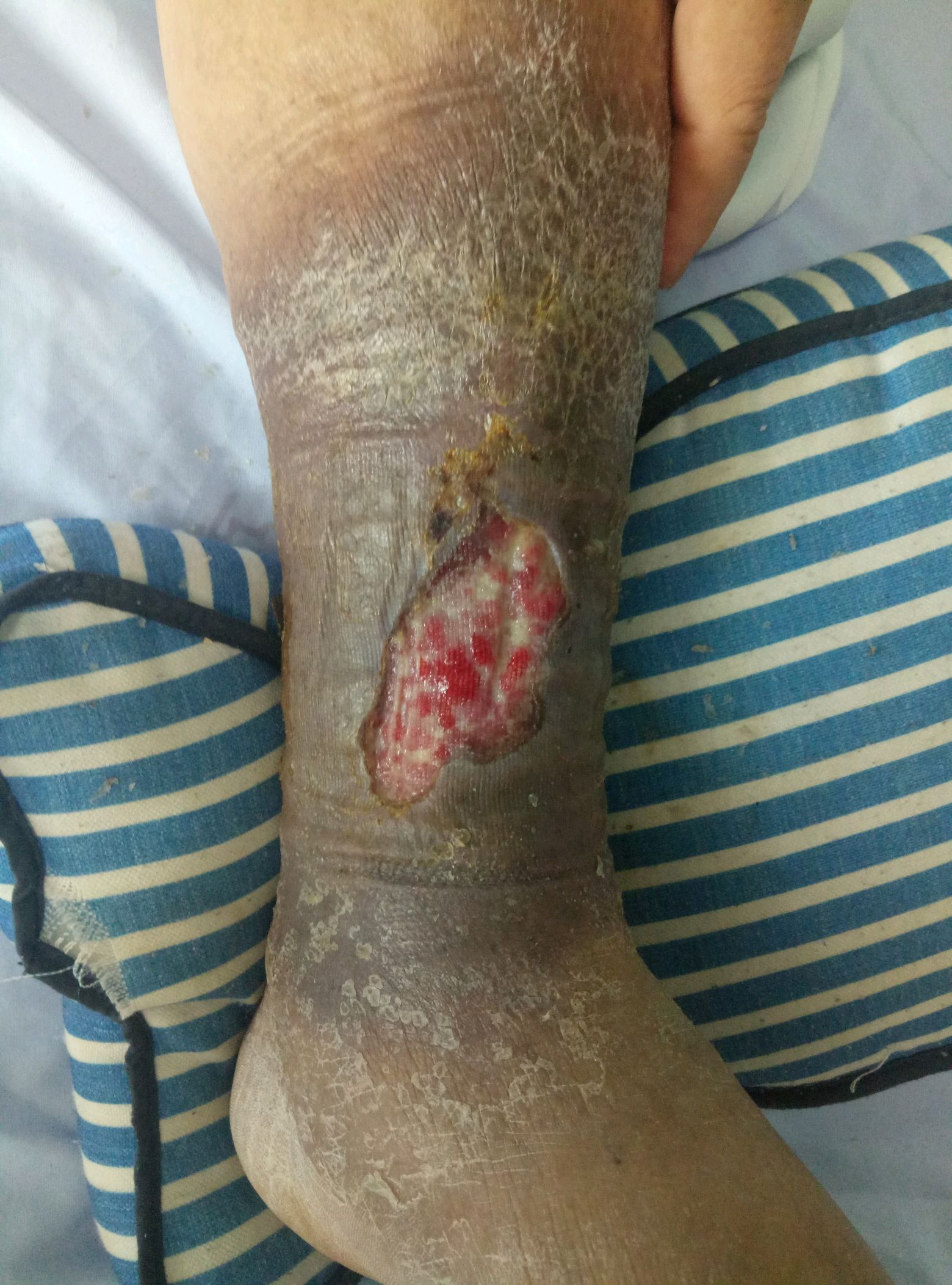 老王(化名),今年50多岁,10多年前因左下肢静脉曲张行手术治疗,未彻底治愈。近1年来,下肢因为静脉高压导致循环障碍致使左侧小腿形成溃疡(图1),自行换药后未改善,后因溃疡部位大出血就诊。