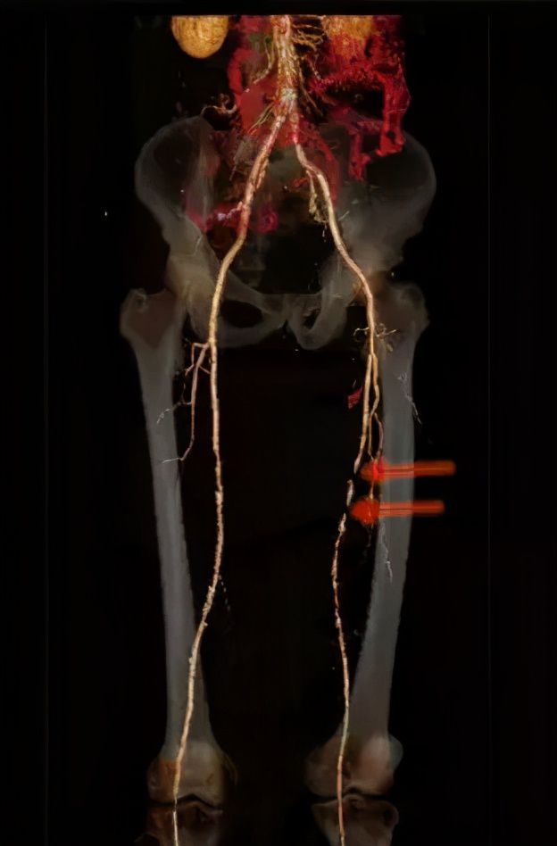 入院当天CTA血管成像检查,诊断为下肢动脉硬化闭塞症。血管外科黄智勇主任采用微创腔内介入治疗技术,成功在狭窄动脉处置入支架,恢复了血流。