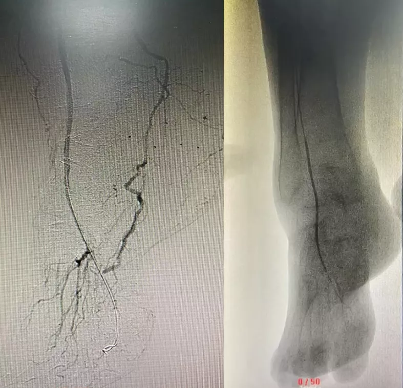 以开头的阿婆为例,就是通过微创介入手术,用导丝开通她的足背血管,直通脚趾,恢复了阿婆的下肢血供。