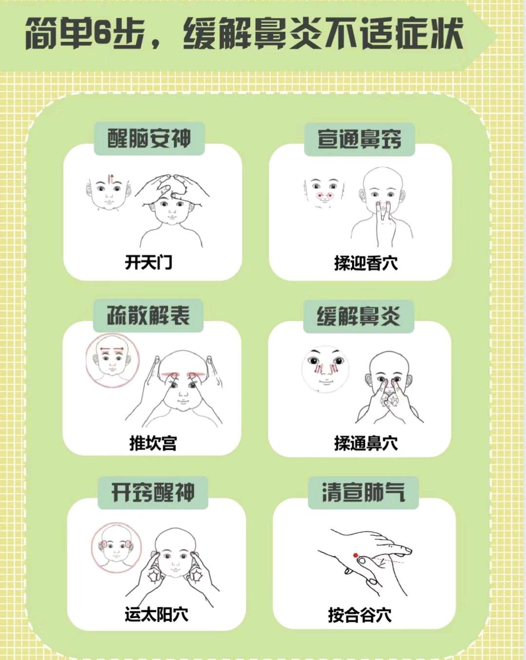 1.推拿。临床上推拿是解决过敏性鼻炎常用的方法,也是家长和患儿最易接受的方法。常用的手法如揉迎香、开天门、揉通鼻穴、黄蜂入洞等。