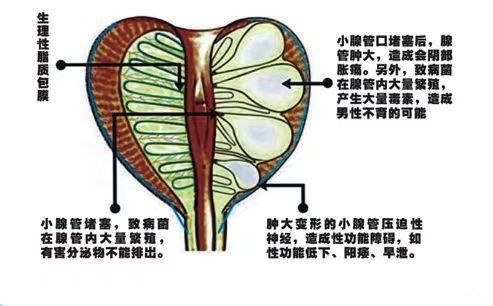 前列腺是尿道的一部分,前列腺有很多腺泡,腺泡分泌液经前列腺导管排入尿道。这些导管本身很细、导管之间又没有相互交通、导管开口属于盲点,这些先天因素导致前列腺排泄不易顺畅;当前列腺发生炎症后,组织水肿压迫堵塞腺管,导致细菌及其代谢产物在腺泡内积聚,不易排出;慢性前列腺炎还会导致腺体实质纤维化与瘢痕形成,腺体萎缩变硬,使药物难以达到有效的治疗浓度,如此更不易治愈。炎症加重堵塞,堵塞加重炎症,如此恶性循环。