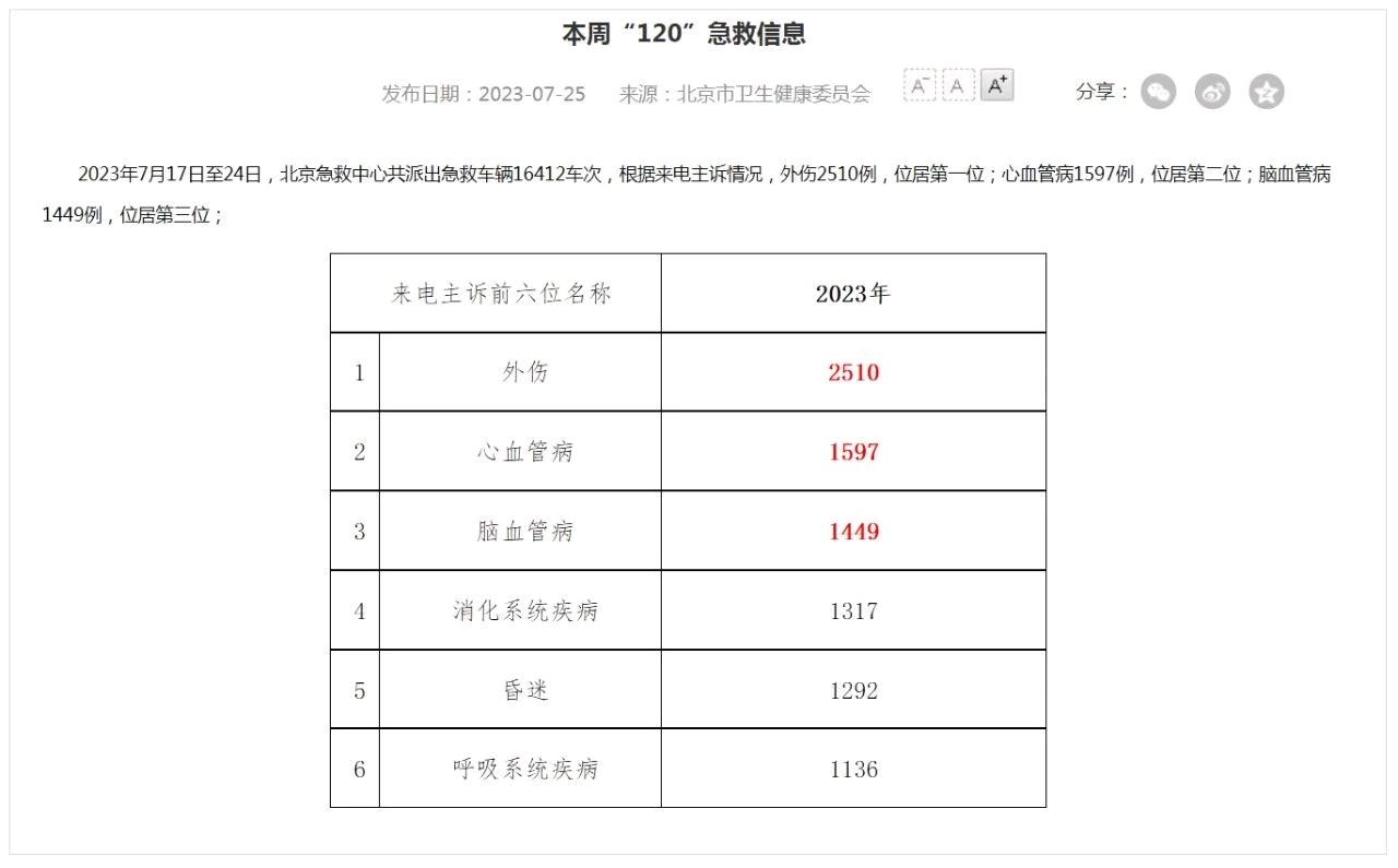 据北京市卫生健康委员会发布的120急救信息显示,2023年7月17日至24日,北京急救中心共派出急救车辆16412车次,根据来电主诉情况,外伤2510例,位居第一位;心血管病1597例,位居第二位;脑血管病1449例,位居第三位。其中脑血管病相较之前明显增加。