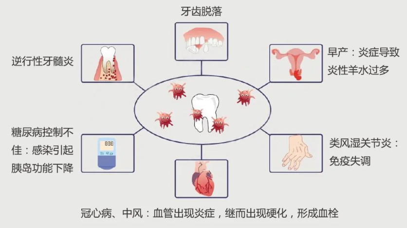 但牙周病对我们健康的影响,不仅仅是掉光牙齿,影响咀嚼和美观这么简单。有多项研究表明:牙周病与糖尿病、癌症、中风、老年痴呆等关系密切。可以说,牙周病会影响全身健康。