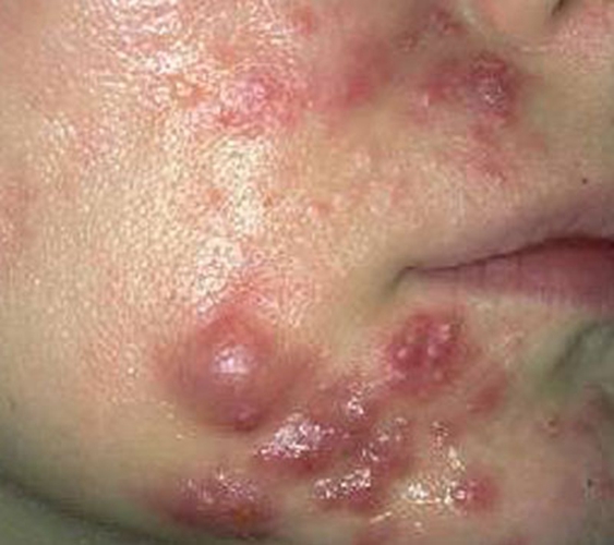 4、Ⅳ级(重度)在Ⅲ级基础上,有囊肿、结节、癫痕形成,皮损发生于上半身。