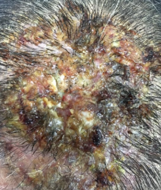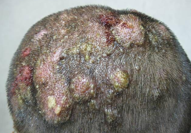 皮损初起为成群的炎性毛囊丘疹,逐渐融合成隆起的炎性肿块,质地软,其表面在毛囊口处形成蜂窝状排脓小孔,可挤出脓液。皮损处毛发松动,易拔出。常伴耳后颈、枕部淋巴结肿大,轻度疼痛和压痛,继发细菌感染后可形成脓肿,亦可引起癣菌疹。可破坏毛囊,愈后常留有永久性秃发和瘢痕。