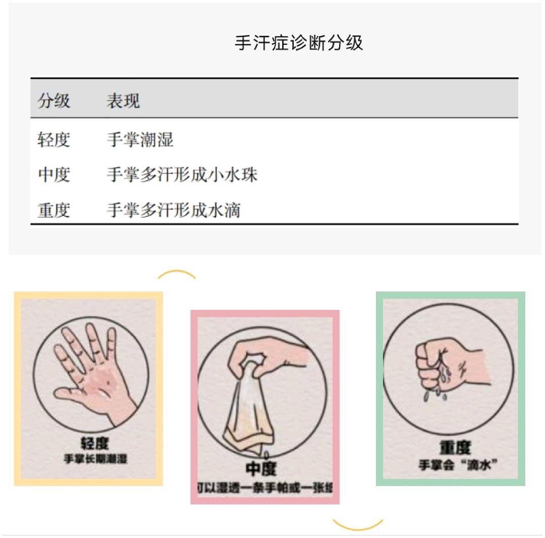 4 、重度手汗伴多种组合,最常见的包括:①手掌+足底 ②手掌+足底+腋窝 ③手掌+腋窝。