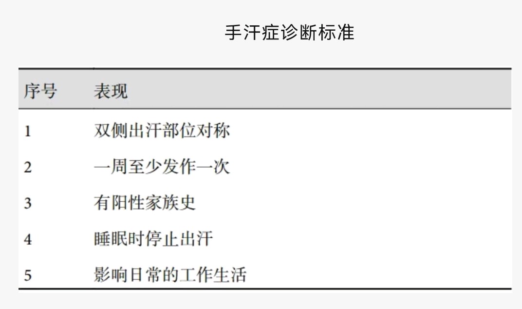 手汗症是一种临床表现明显的病症,一般有下列表现: