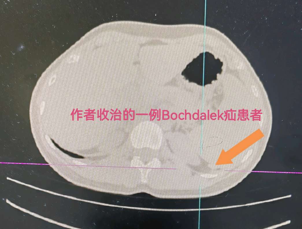 (2)后外侧膈疝:Bochdalek疝,又称胸腹裂孔疝,腹内脏器通过膈后外侧的胸腹膜孔疝入胸腔则称胸腹膜疝,膈肌由多部分组成,其中外侧部由胸腹膜皱襞和胸壁肌肉组成,膈肌最后闭合的部分就是后外侧部三角区,即还在胚胎发育期右侧Bocadalek孔团合较左侧为早,故左侧胸腹膜疝较常见。膈肌在发育过程中出现障碍,膈肌的胸腹膜裂孔延迟闭合,或肠管过早转入腹腔,腹内脏器容易经此孔脱出。因此胸腹膜疝是胎儿时期发生的一种疝,可能同时合并其他畸形,如肠旋转,先天性心脏病,肺发育不良等。此型大多无疝囊,疝内容物有小肠、结肠、肾脏、脾脏、胃、肝左叶等。