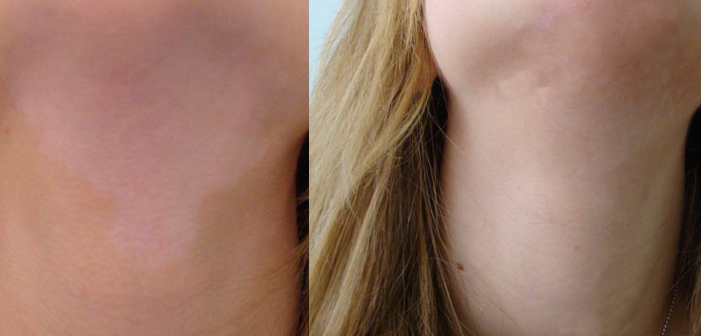 黑色素合成的速度快,白斑颜色也会逐渐恢复到正常肤色,皮肤颜色由云白色或瓷白色转变为淡白色,再逐步到深褐色,说明皮肤慢慢接近正常皮肤,白斑逐步消退。