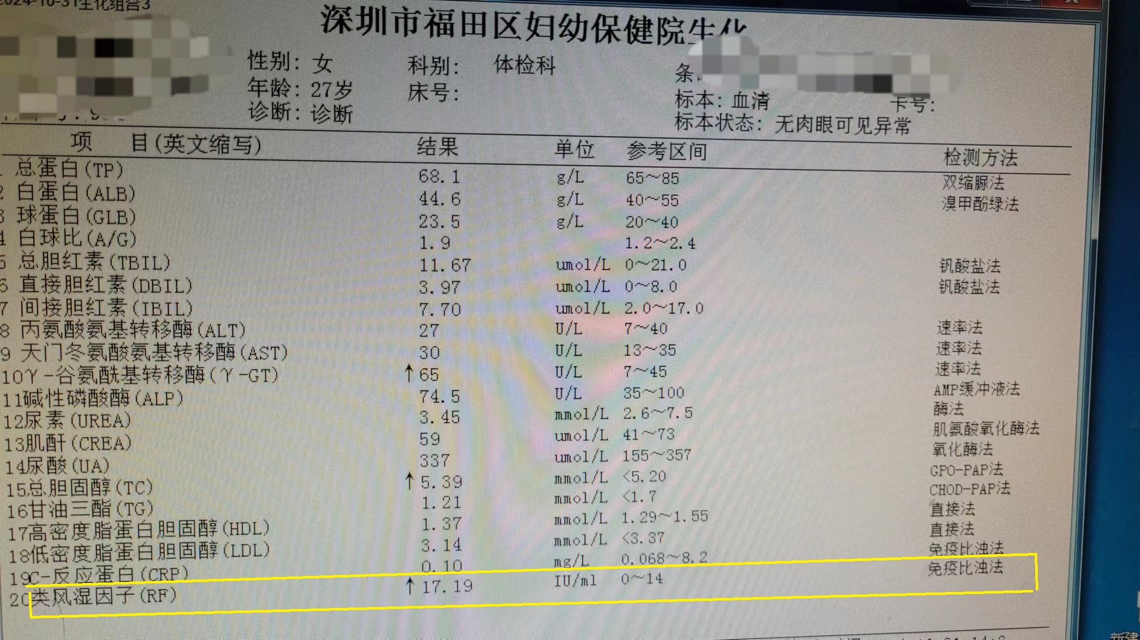 体检报告相对常见的是类风湿因子(RF)偏高,可能让人一下子就紧张起来,觉得自己是不是得了类风湿关节炎。
