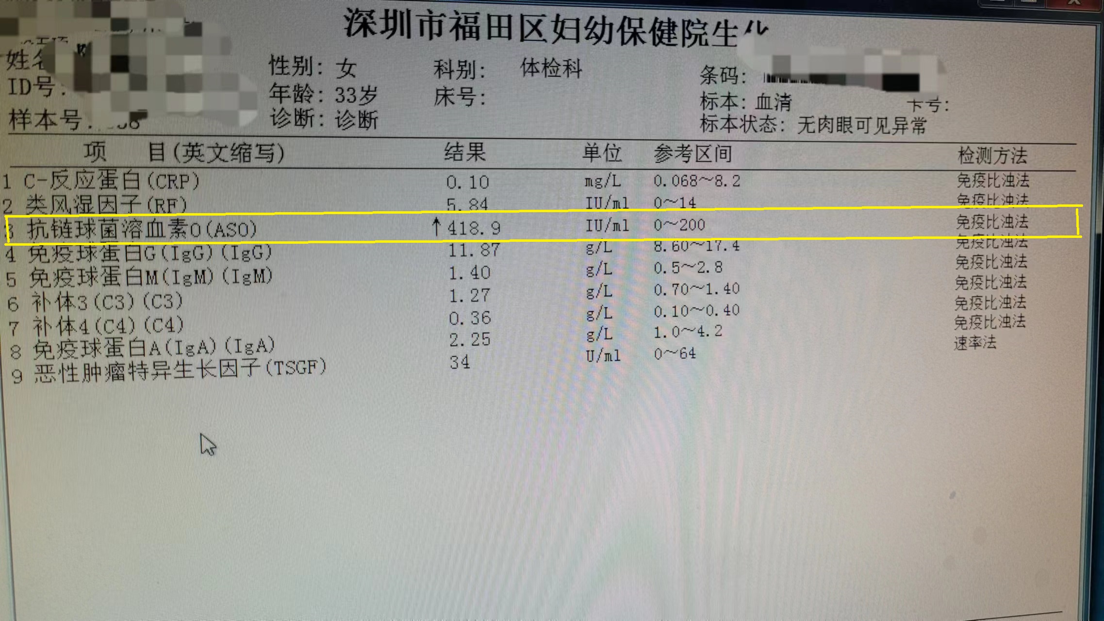 另外一个常见的异常指标常见于ASO,简称‘抗O’。这是一种检测身体对链球菌感染免疫反应的血清标志物,主要用于判断是否近期受到A群链球菌感染。ASO水平升高常见于链球菌引起的疾病,如扁桃体炎、风湿热等。ASO升高本身不一定意味着疾病,需要结合临床症状综合判断。如果ASO持续升高且呈高滴度同时伴有症状,如关节疼痛、心脏异常或肾脏问题,则需要进行干预和治疗,避免可能的并发症。打个比喻:它就像是在你身体里的一份老档案,告诉医生你过去可能经历了一场链球菌的侵袭,但这并不意味着你的关节现在正面临攻击。很多时候,这些指标只是身体免疫系统的“历史痕迹”,并不需要太过担心。