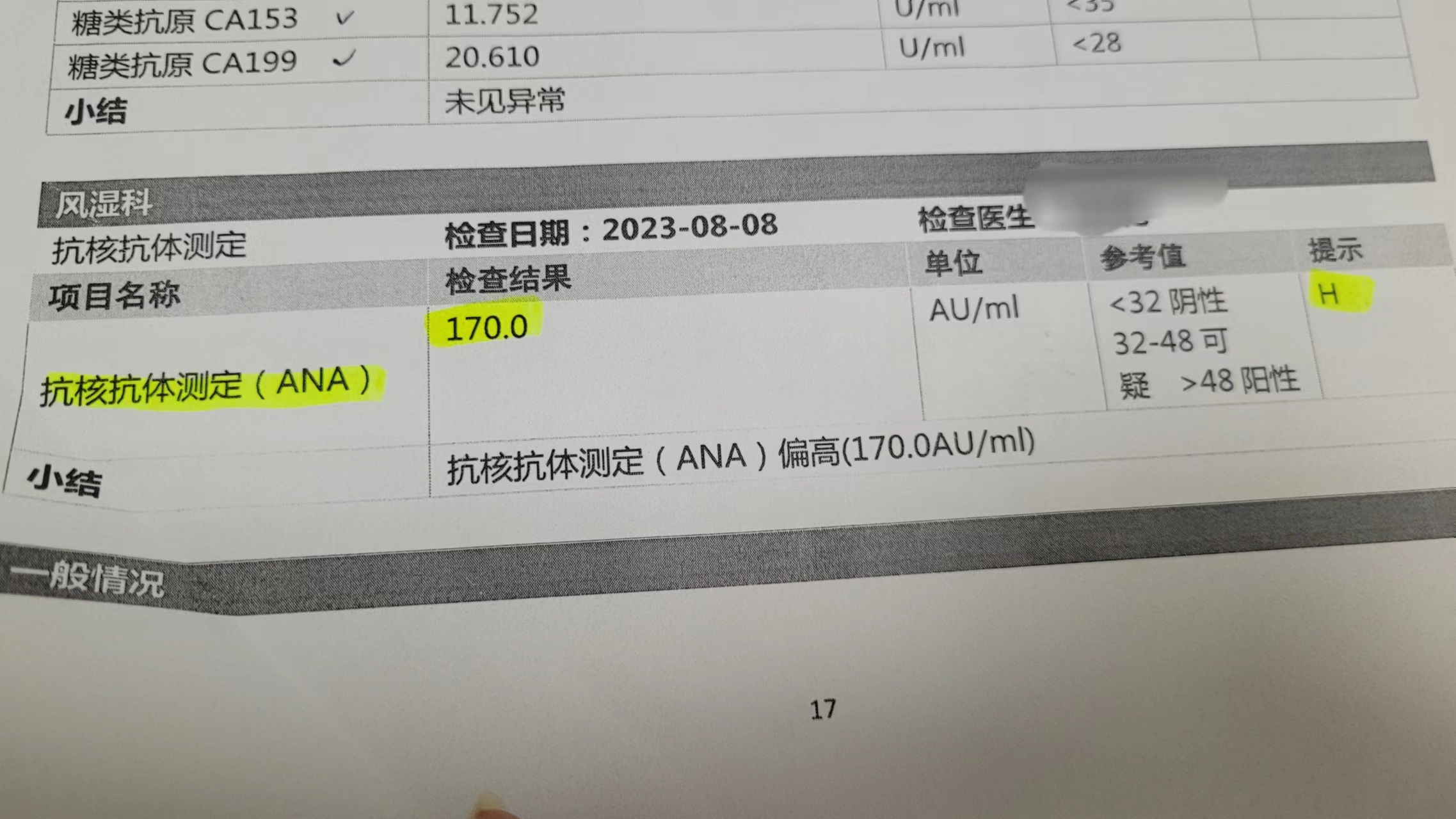 所以,体检报告发现风湿指标异常怎么办?首先,别急着自诊自医。最好的办法是找风湿科医生做进一步评估。早发现早干预是风湿病治疗的关键。体检报告上的数字并不是单独存在的,而是需要结合症状来看。如果你身体并没有什么特别的不适,那很多时候这些指标的波动并不需要过于担心。总之,疾病诊断需综合判断,定期体检有助早期发现问题,但报告解读应由专科医生提供科学意见。