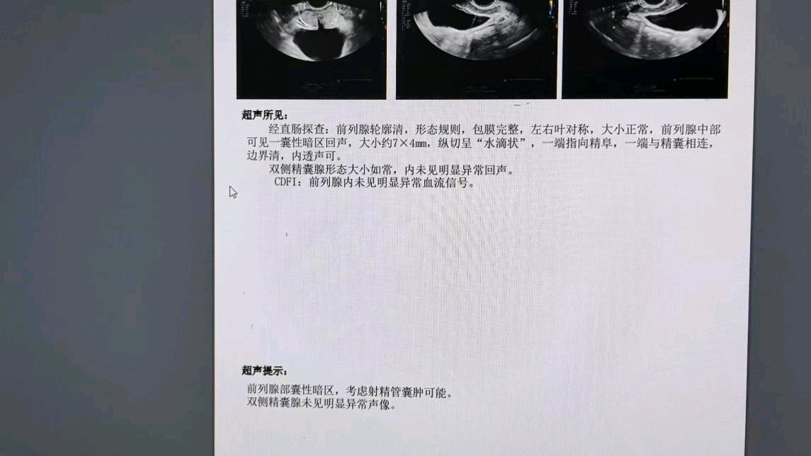 遇到这种疑难患者,以我们宋明哲主任一贯的严谨治学风格,肯定是要组织科室大讨论的 ,经过全科缜密的讨论分析,最终锁定了患者的射精管囊肿,它虽然是个小小的囊肿(7*4mm),但它一端指向精阜,一端与精囊相连(不得不夸奖下我们超声科的同事,能做出这么详细的报告,赞赞赞),这么一个“地理位置”特殊的囊肿,很可能就是导致极度弱精的始作俑者。