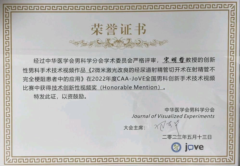 中妇男科中心团队一直注重精囊镜在泌尿男科疾病诊治中的应用。除常规用于血精、射精管梗阻引起的无精子症的诊治外,近年来,我们还将精囊镜开创性应用于射精管疾病相关性少弱精子症的诊治,术后辅助中医药治疗,屡获奇效。该项目曾获2022年度第二届CAA-JoVE全国男科创新手术技术视频比赛“技术创新性视频奖(Honorable Mention)”。