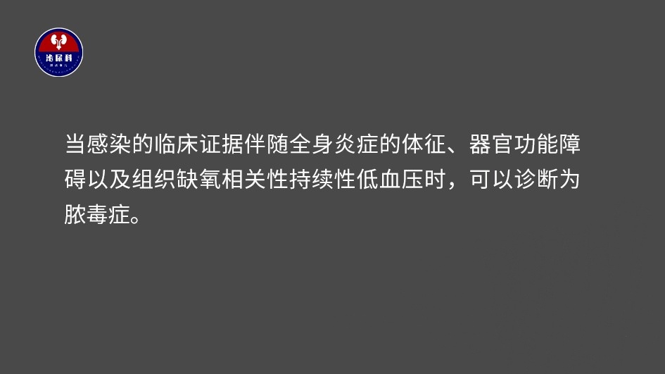 当感染的临床证据伴随全身炎症的体征、器官功能障碍以及组织缺氧相关性持续性低血压时,可以诊断为脓毒症。