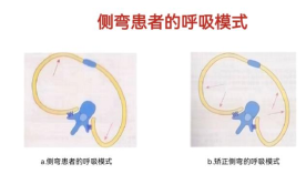 如果我们把孩子的胸廓展示出来,从上往下看,就会如图a所示:整个胸廓是往顺时针旋转,而这种胸廓的畸形又会导致呼吸模式的改变,即孩子每一次呼吸都会倾向于把气吸到左前胸,以及右侧后背。话句话说,如果错误的呼吸不去改变的话,每一次呼吸都有可能会增加侧弯的角度。