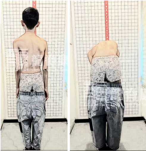 大部分胸椎右侧凸的孩子,他们的胸廓都是右后旋,如下图2,当孩子弯下腰即可明显右侧后凸的胸廓。