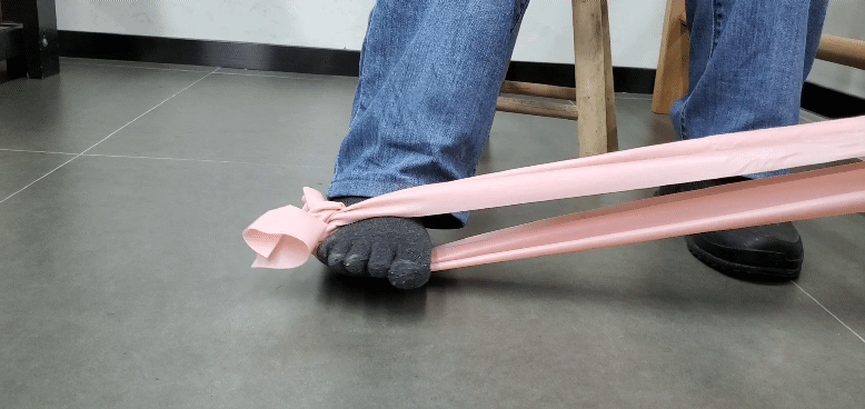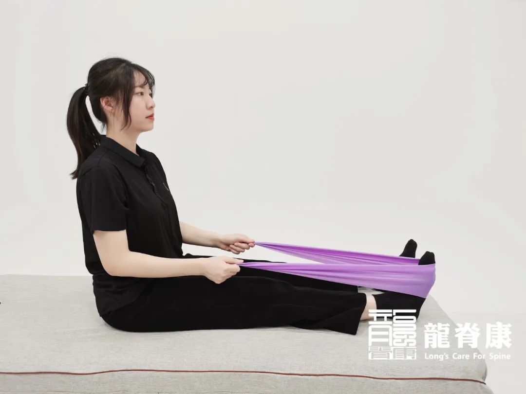 以弹力带为阻力,远端固定(或握在手中),套在脚上,从伸直位尽量用力勾到屈曲位,稍作停顿,慢慢放开,反复做20次,休息30秒,共做4-6组,每天1-2次。坐在床上或凳子上,用皮筋(脚踝训练带)套住两脚,患脚用力外翻,反复做15次,休息30秒,共做4-6 组,每天1-2 次;内翻练习姿势同抗阻足外翻,皮筋在远端固定,用力内翻,数量和要求同抗阻踝外翻。