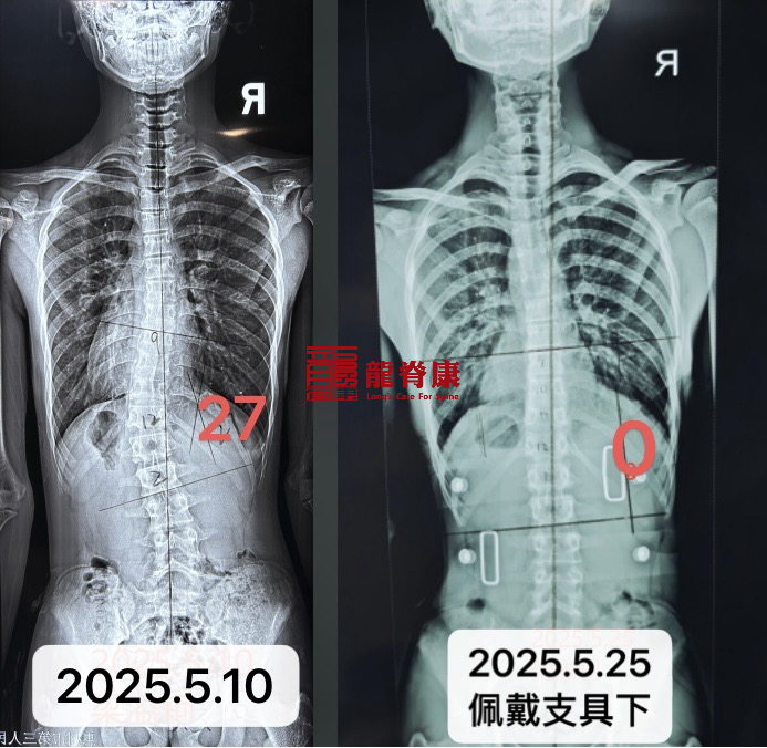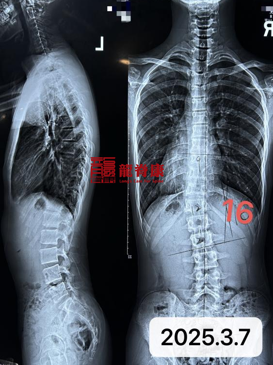 小梁同学今年14岁,在2025年3月,家长发现孩子体态异常,心急如焚立刻带着小梁前往当地医院进行检查,通过拍全脊柱X光片诊断,小梁被确诊为脊柱侧弯16°,骨龄Risser4级;外院医生建议保守治疗在家进行吊单杠,2个月后复查拍片发现侧弯度数加重,度数加重至27°。