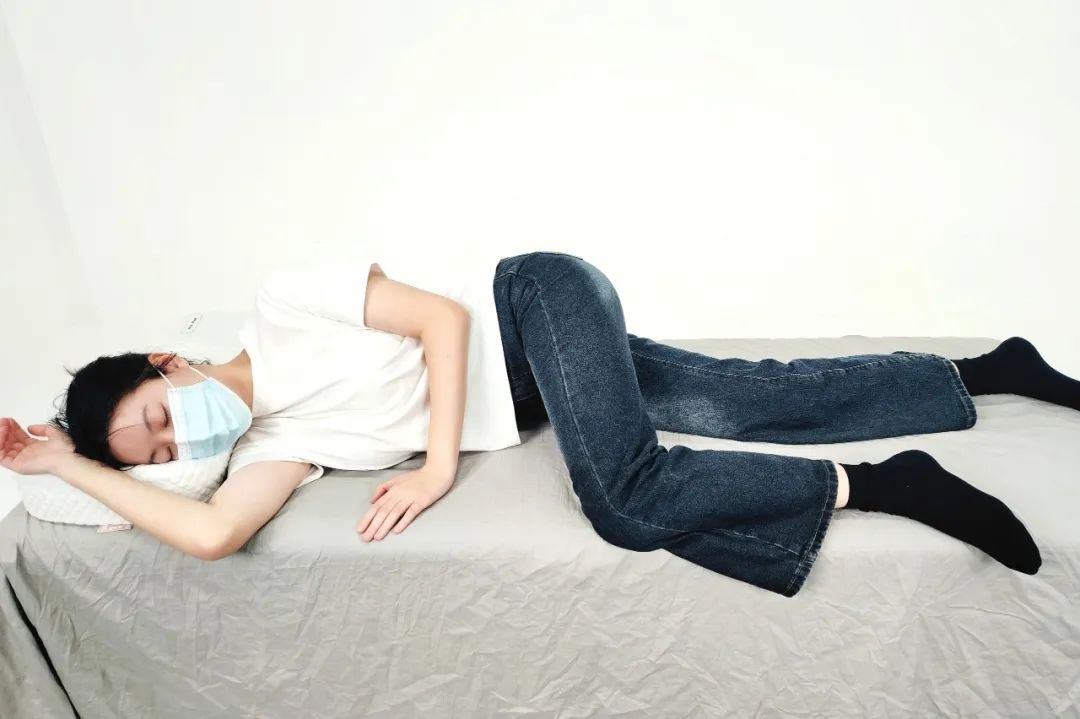 侧趴在床上,单侧或双侧膝盖弯曲抬高,臀部后翘。部分人认为这种姿势能放松腰背,或因幼年习惯、肥胖导致呼吸不畅而自然形成,实则加剧脊椎损伤: