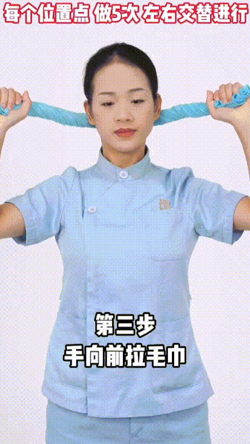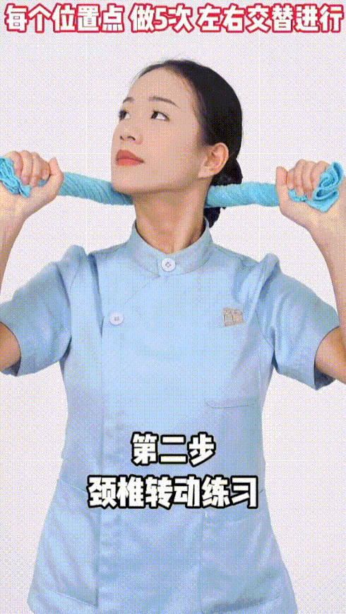 ②颈部旋转对抗毛巾操:双手拿住毛巾两端,放在颈椎上段位置,手臂稍用力将毛巾向前拉,并向左侧转头,重复5-10次,换右侧转头,颈椎中段和下段操作,步骤同上。