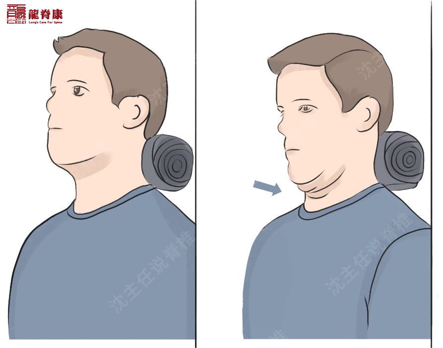 ④后缩下巴:一手放下颌,另一手放头后上方。下颌收紧发力,将头部往斜后上方45°发力,头后上方手往前推,保持15秒,重复3-5次。