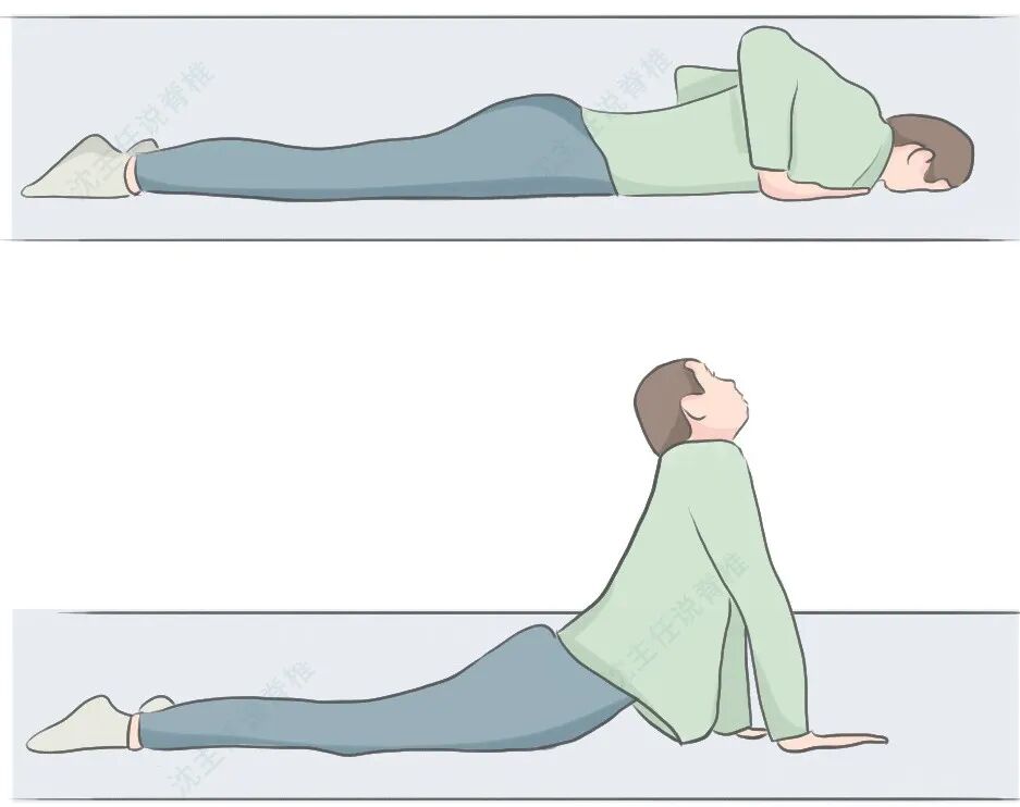 眼镜蛇式:俯卧位手掌撑于肩下,缓慢抬起上半身,骨盆不离床,维持15秒后放松,重复3-5次。促进髓核前移,减少椎间隙后方压力。