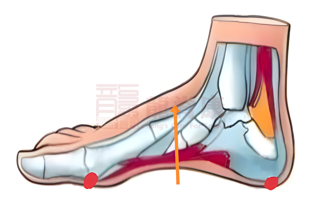 ② 足弓拱起训练:脚跟与跖骨头(图中红点部分)着地,将足心向上提起,每组10次×3组,每天2次。