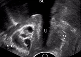 ▶ 1、经直肠或经阴道途径:可应用双平面腔内探头或者腔内端射式探头进行检查,应用双平面腔内高频探头扫查时可获得尿道正中矢状切面及横切面。