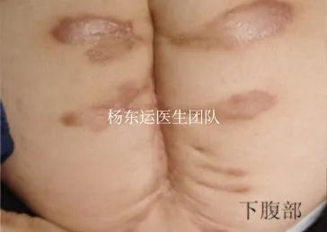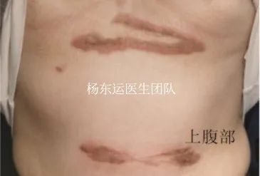 腹部尤其是下腹部,并非疤痕疙瘩的好发部位,但这个病人的上、下腹部都发生了严重的疤痕增生。