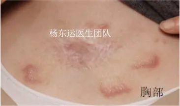 比如下面这个病人,胸部和上腹部在既没受伤、也未手术的情况下,自发出现了严重的疤痕增生。