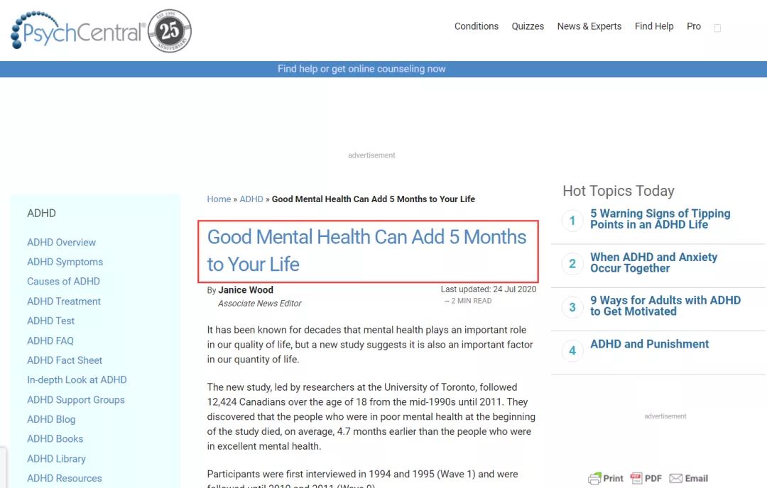 在研究开始时心理健康状况非常好的人,比心理状况不佳的人,寿命平均长4.7个月。