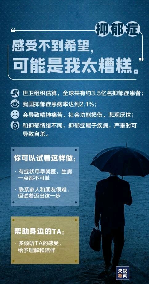 除抑郁症外,常见的心理健康问题还包括躁郁症、强迫症等,值得一提的是,心理健康问题一旦确诊,自己很难走出来,必须要及时就诊,以免造成不可挽回的悲剧。
