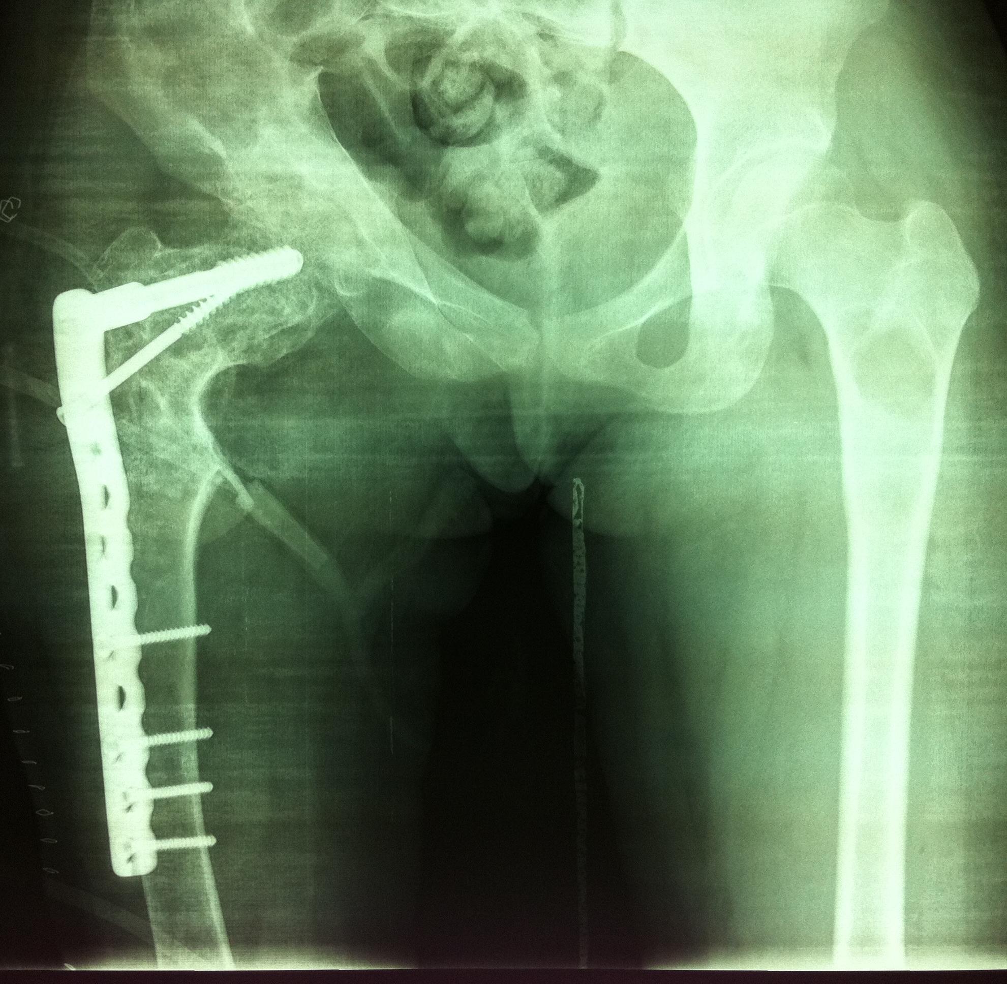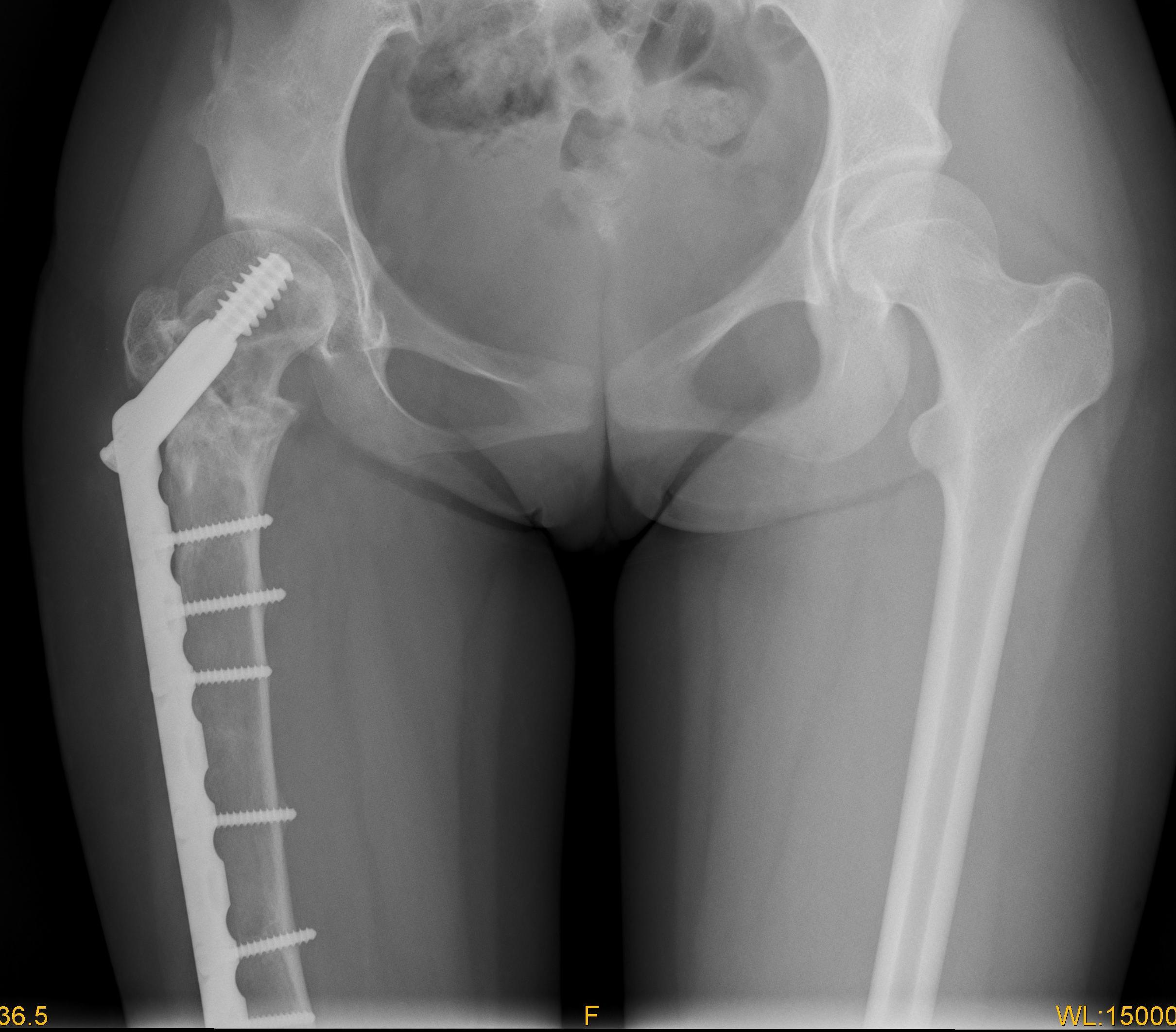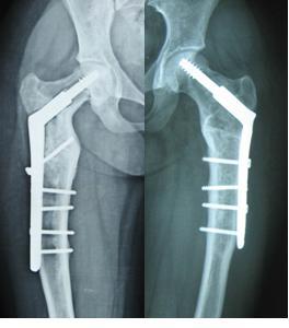 患者仰卧位,患侧稍垫高,采用股骨近端外侧直切口入路,显露股骨近端,保护周围软组织及骨膜,先在股骨大转子处对准股骨颈中心打入2.5mm直径导针,用C型臂或G型臂X光机检查正、侧位是否在股骨颈和股骨头的中心,测量长度后旋入动力髋(DHS)或动力髁(DCS)之螺纹钉,根据术前测量设计好的方案打入DHS或DCS钢板,此时,再在转子下区股骨畸形顶点处附近按术前设计模板截骨,由于重度畸形患者常伴有股骨颈前倾角改变及股骨轴线旋转畸形,截骨时应同时矫正,截骨后复位固定前,先用刮匙或球形磨钻尽量去除股骨颈及截骨处髓腔内病变组织,送病理活检,采用打压式自体髂骨加同种异体骨植骨(山西骨库提供),充填股骨头、颈及截骨断端,植骨完成后牵引状态下试行复位,畸形严重者复位对合欠佳时,可用尖刀点状松解臀中肌及周围挛缩组织;若股骨破坏较严重,股骨距已破坏,骨质条件较差,截骨时应采用内移外翻截骨,将截骨远端修整后擦入近端,复位后固定钢板,因股骨病变广泛,骨质菲薄,因此尽可能选用加长的DHS或DCS钢板,但螺钉不要打的太满,以达到固定范围即广泛又牢靠,易于愈合。