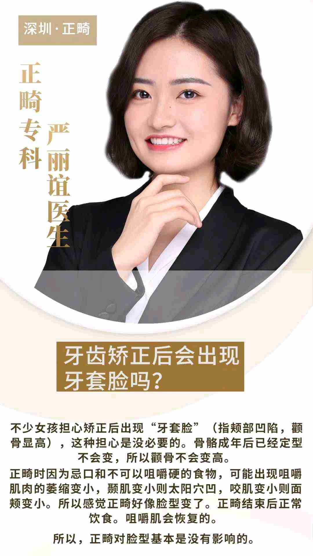 很多女孩子都会担心矫正后出现“牙套脸”(颊部凹陷,颧骨显高),这种担心是不必要的,因为成年人骨骼定型,所以颧骨不会再长高。