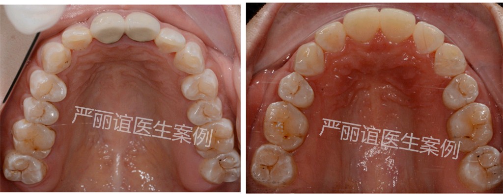 矫正方案:拆除烤瓷桥,临时单冠修复,擦除四个正畸牙,排齐整平上下颌牙列,关闭上下颌间隙,前牙内收,改善面型。辅助唇肌训练。