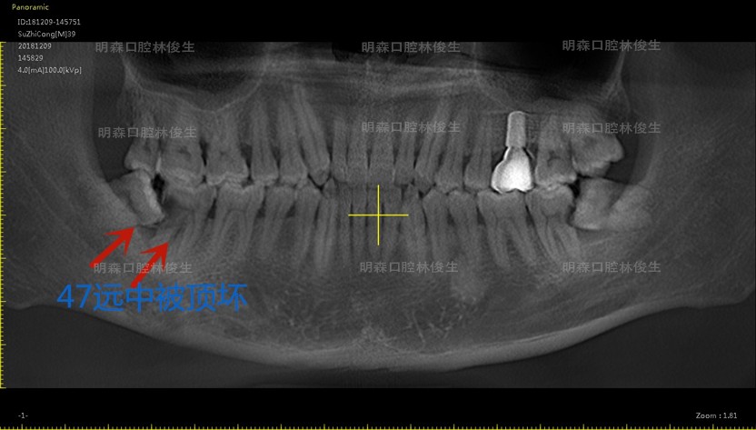 该患者属于远中阻生齿,牙冠向远中(下颌升支方向)倾斜挤压到正常的邻牙,容易引发智齿冠周炎以及领面龋,主要症状包括智齿周围软组织的肿胀、疼痛、糜烂及脓液分泌,导致食物嵌塞造成邻面龋,症状严重者甚至会因阻生齿引起邻牙远中骨吸收,形成牙周袋,诱发牙周炎。