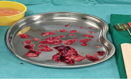 上图:术中在左心房内取出的大量血栓。’